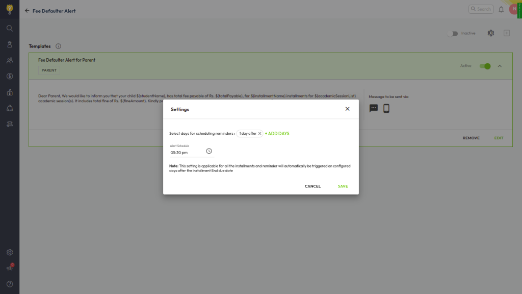 Settings > Collaboration > Communication > Alerts > Fee Defaulter Alert (Parent)