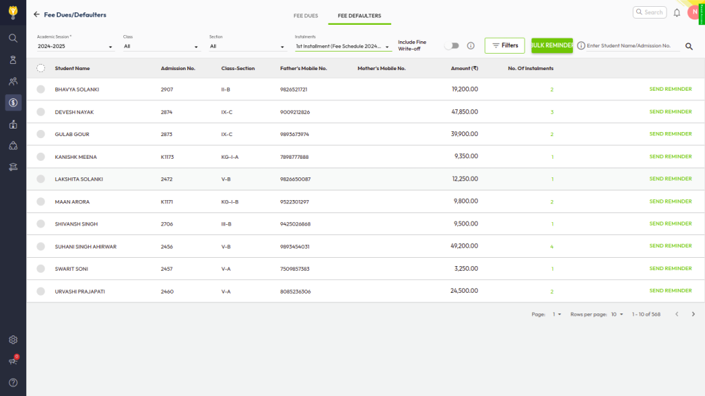 Finance > Fee > Fee Dues / Fee Defaulters > Fee Defaulters tab