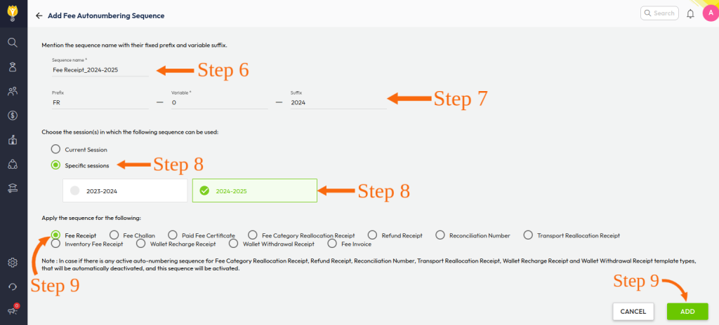 6. Enter the sequence name as per your preference, such as “Fee receipt_2024-2025.”