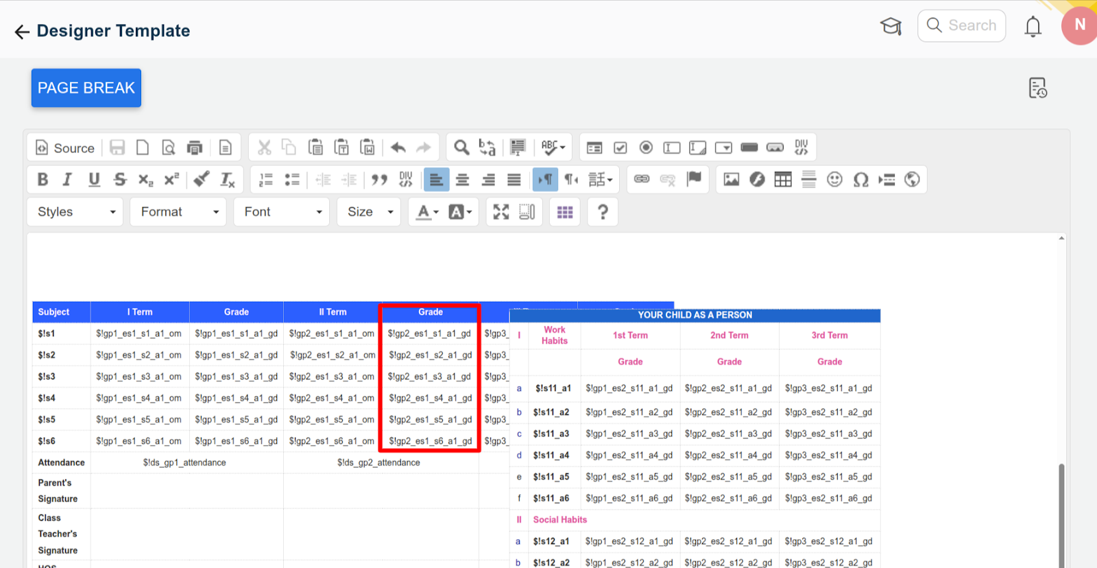 Editing a Report Card Template should only be done if you are familiar with the Visual/HTML Editor. Incorrect modifications may break the layout or disrupt data mapping.