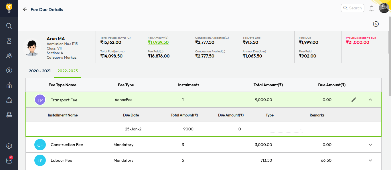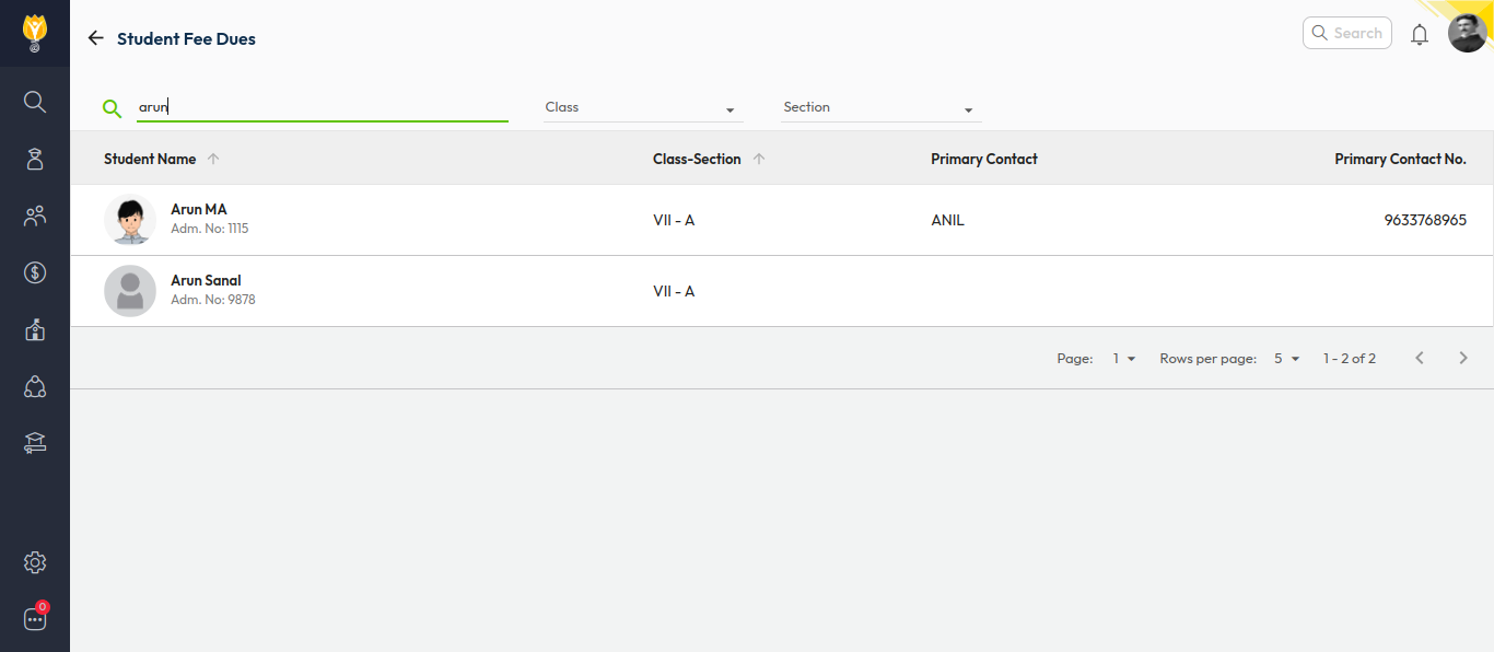 - Search for the student using Name / Admission Number or use Class & Section filters.