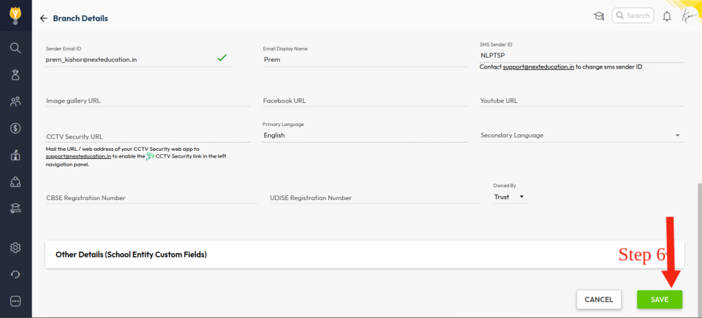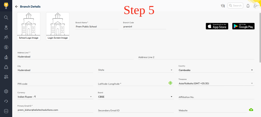 Header details such as school name, address, and branch information are fetched from the Branch Details section. To update them: