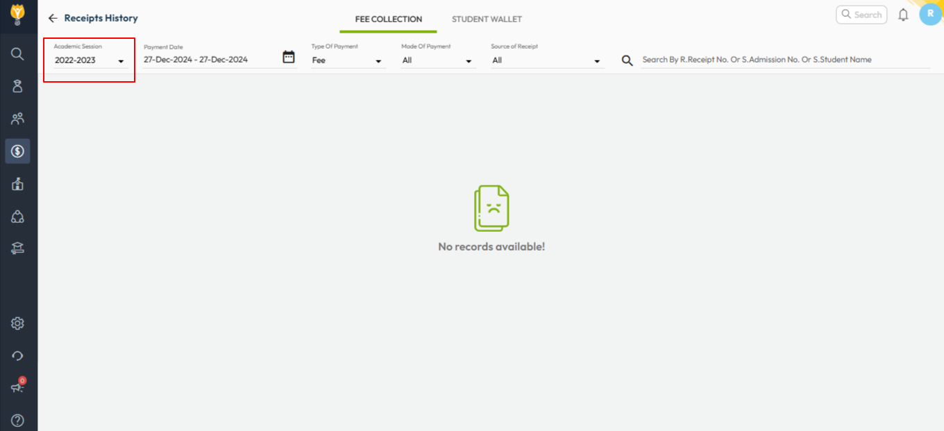 - Additionally, you can search with the receipt number, student name admission no. etc.