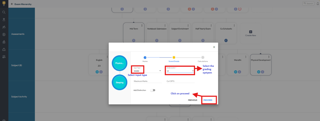 - Select the Class, then expand the structure to choose the corresponding Term, Assessment, and Subject (Physical Development).