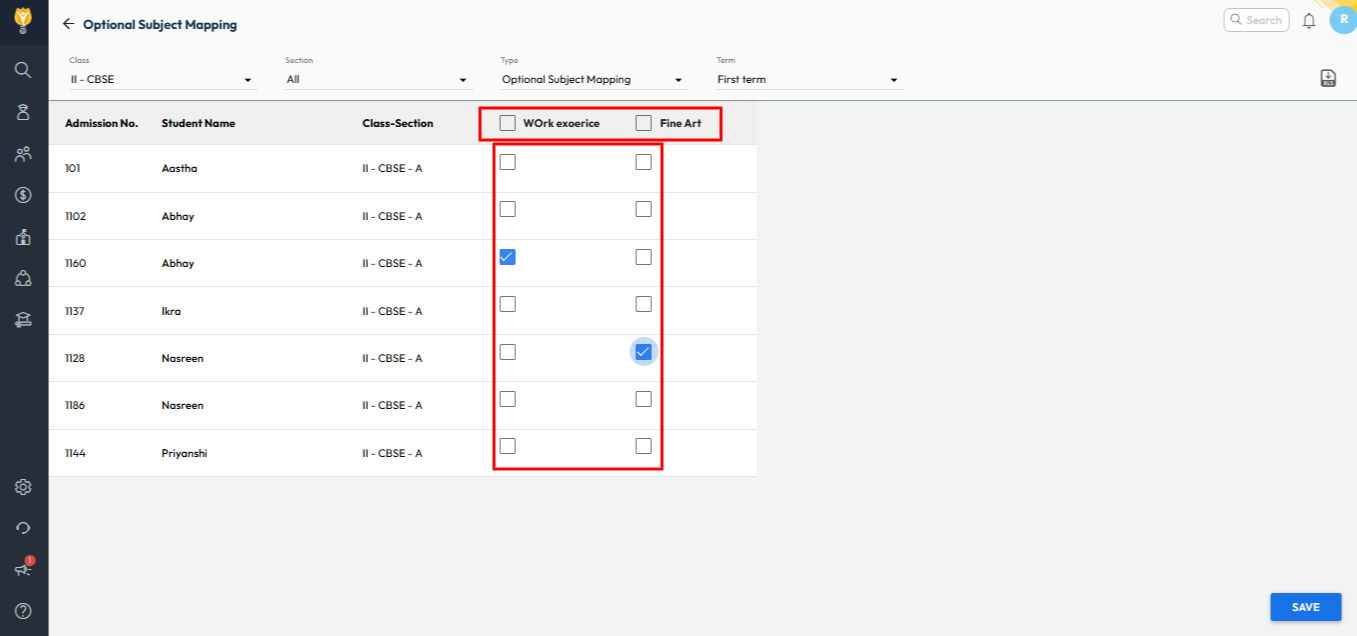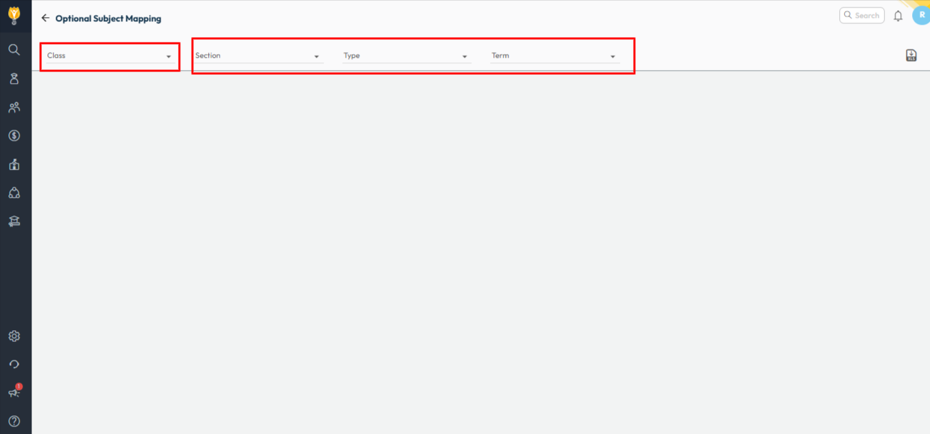 - Select the Class, Section, set Type as Optional Subject Mapping, and choose the Terms (All for full year, or a specific one).