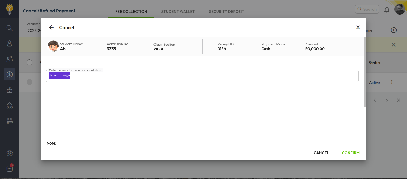 If a student has already paid the fee in the current class, the payment must be cancelled before changing the class.