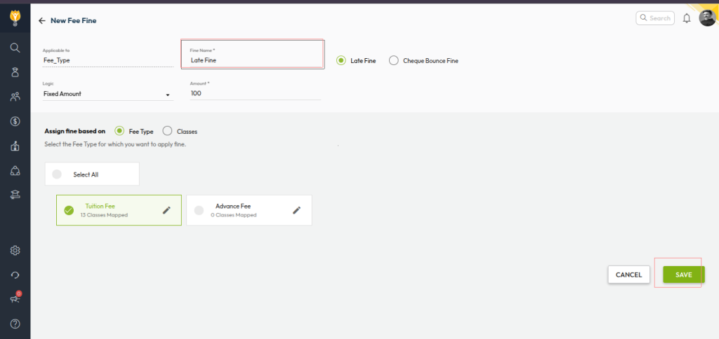 - Update the Fine Name to the label you want displayed (e.g., Late Fee Charges)