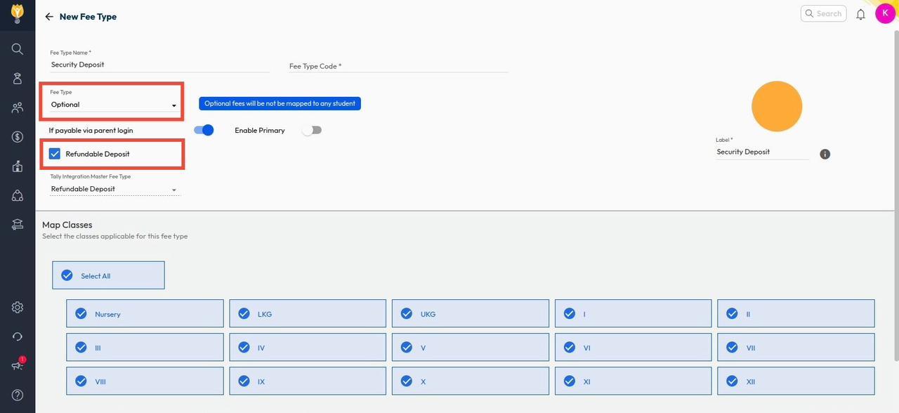- Select Fee Type: Optional and mark it as Refundable Deposit.