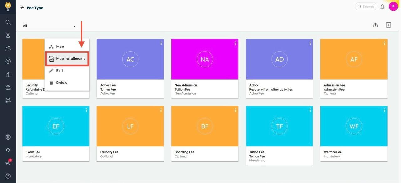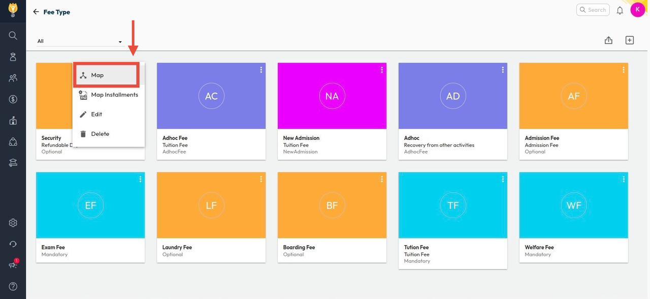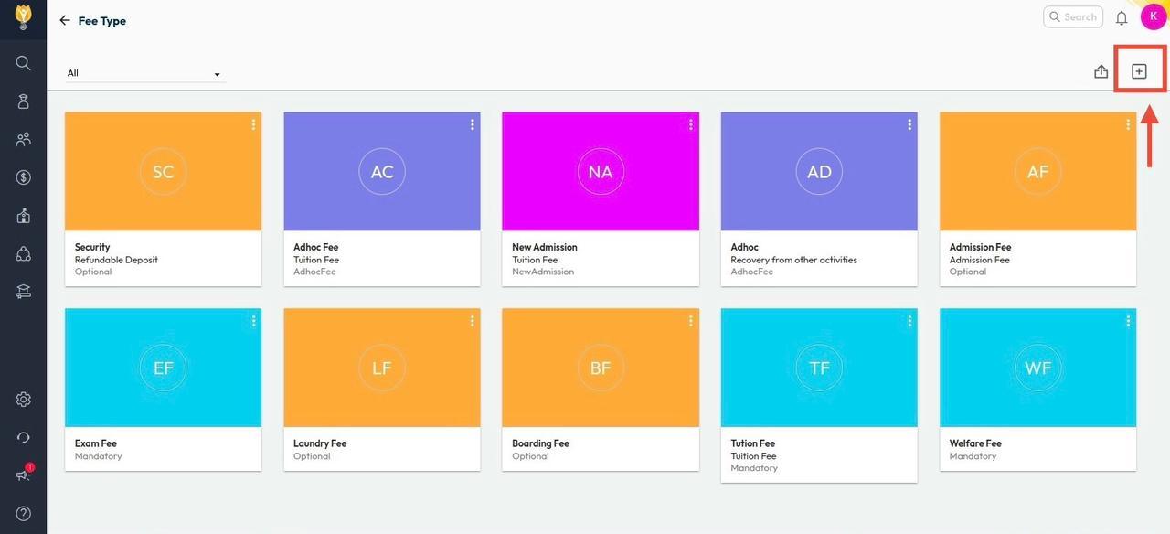 - Navigate to Settings > Finance > Fee > Fee Type.