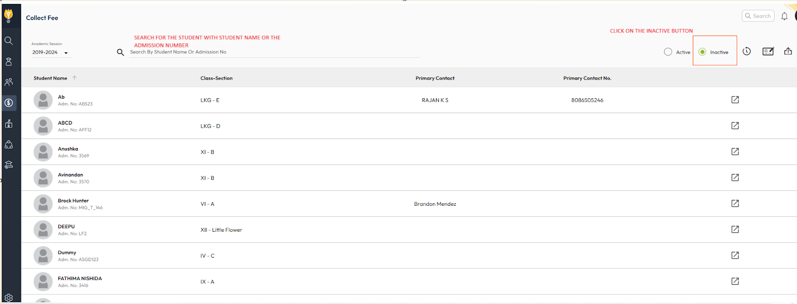 Fees for inactive students can be collected directly from the Fee Collection screen.