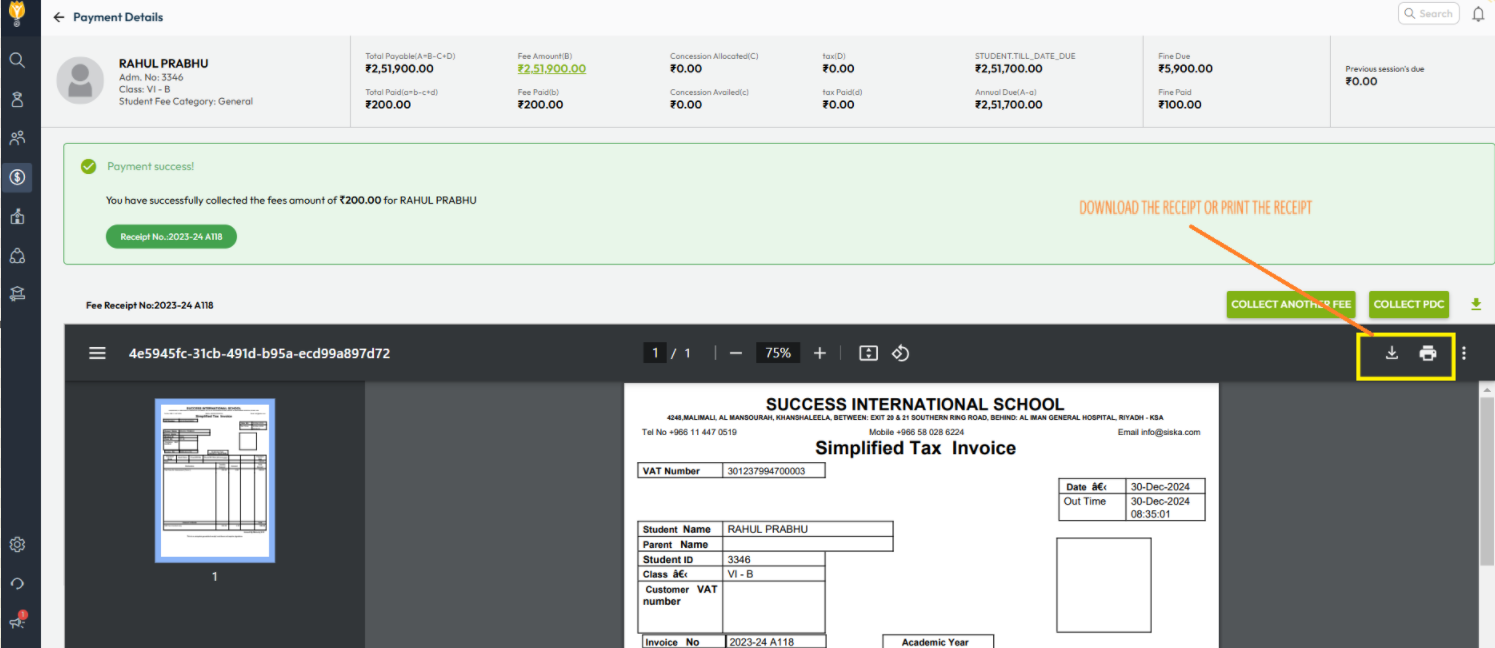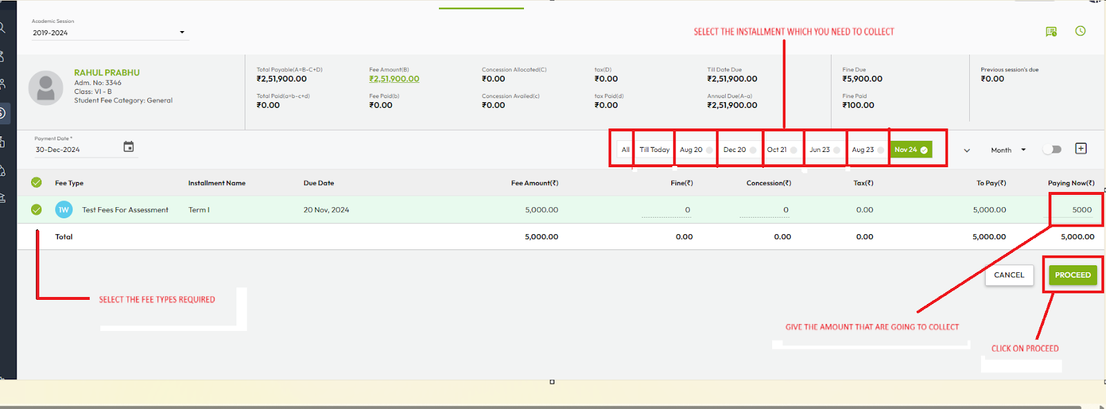 - Select the student and choose the required fee type and amount.