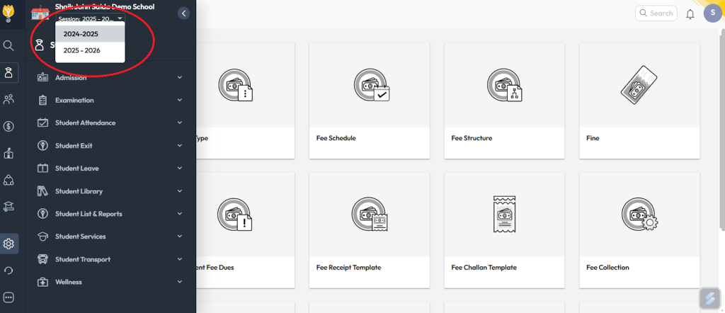 To configure optional fees for a future academic session, new academic session must be created. Follow the steps to define it :