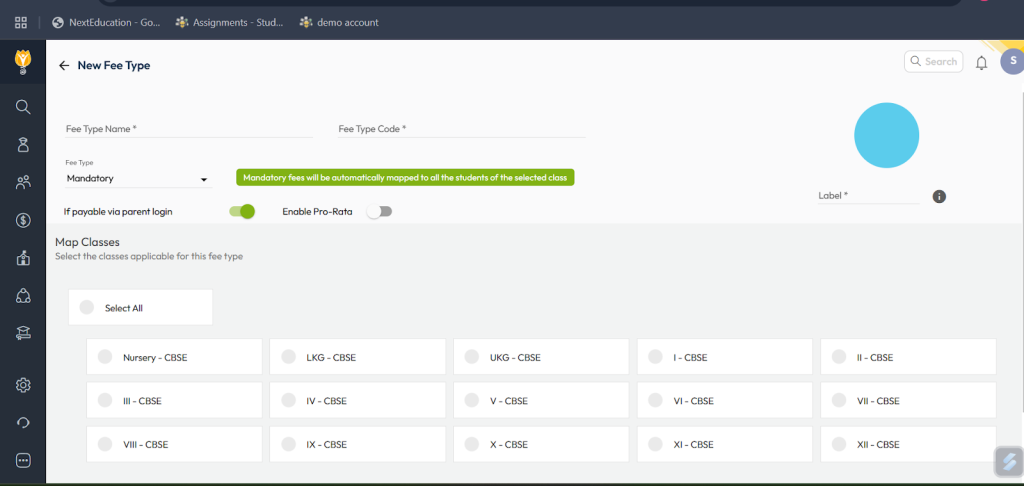 - Fee Type Name (e.g., Sports Fee, Lab Fee, Hostel Fee)
