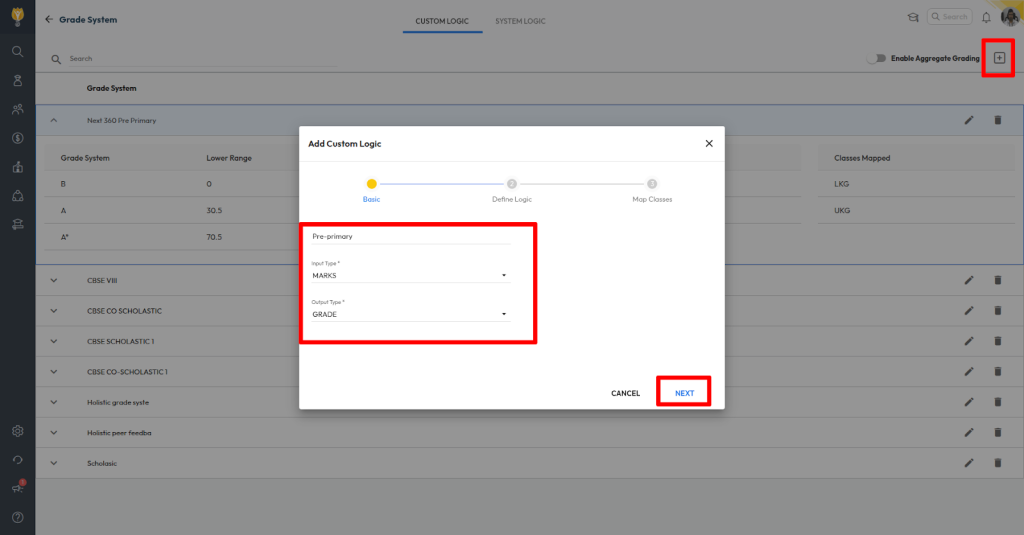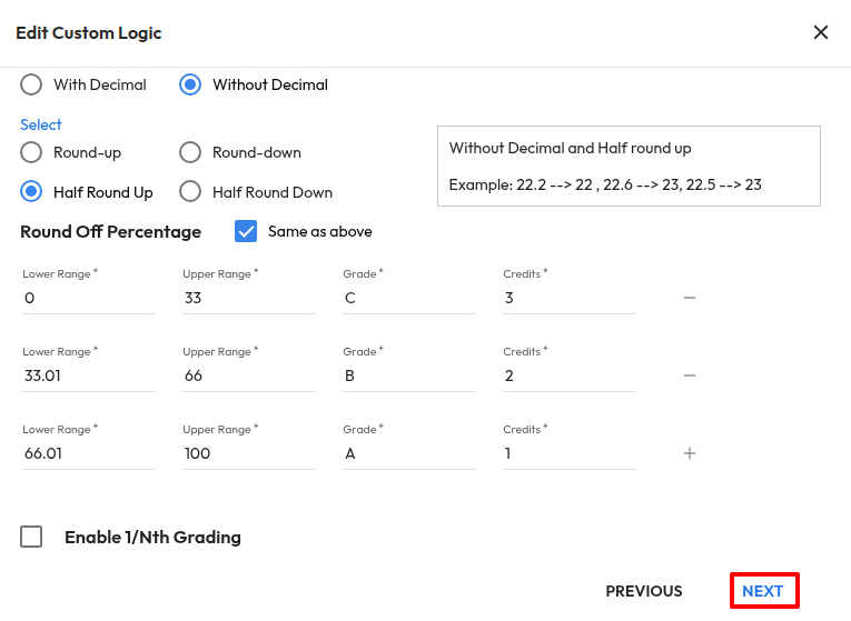 5. Provide a Grading Scale Name, define the Input Type and Output Type, then click Next.