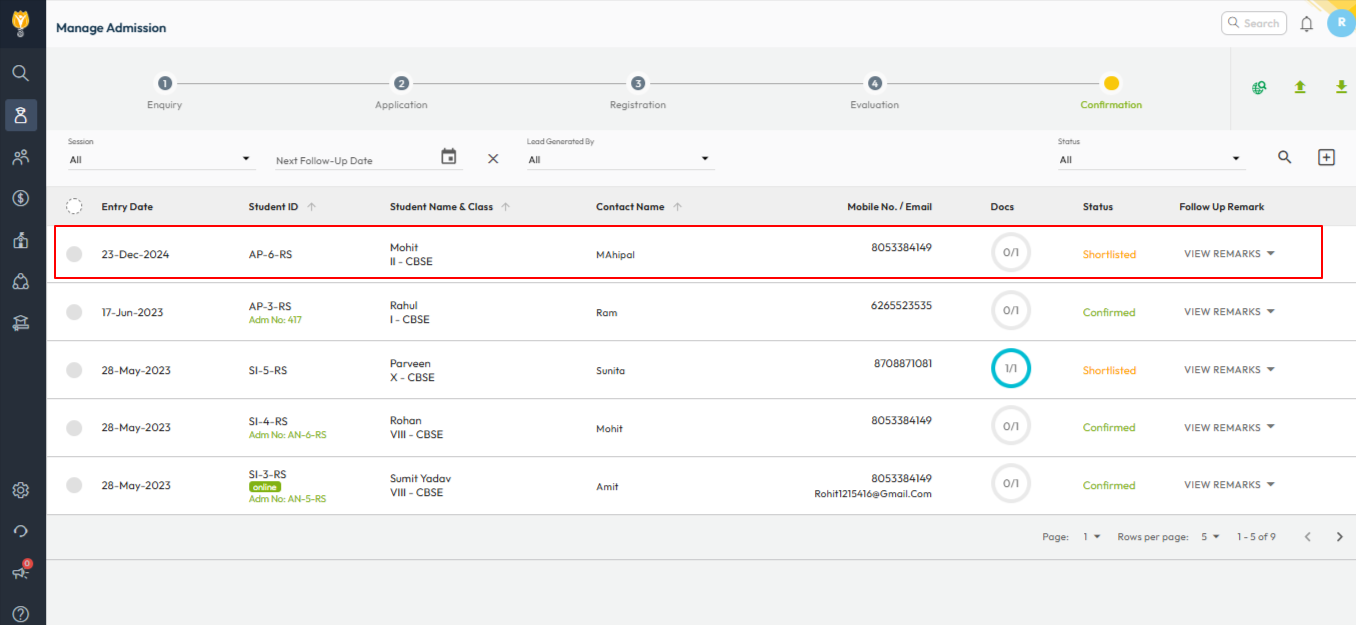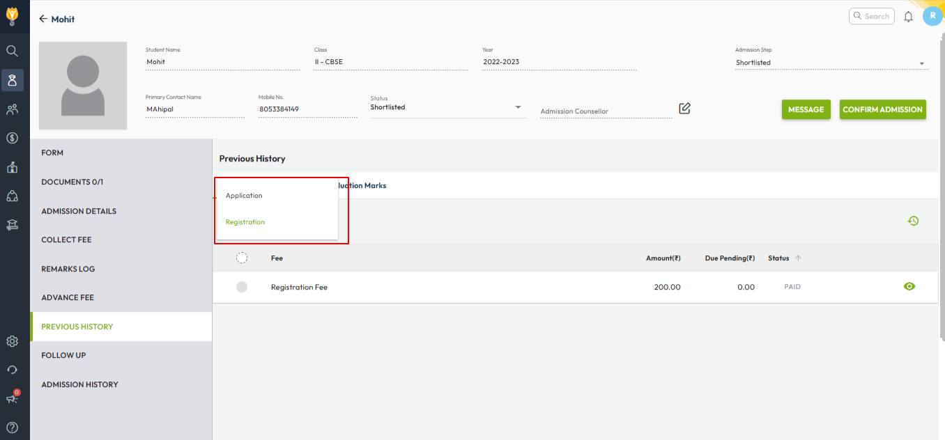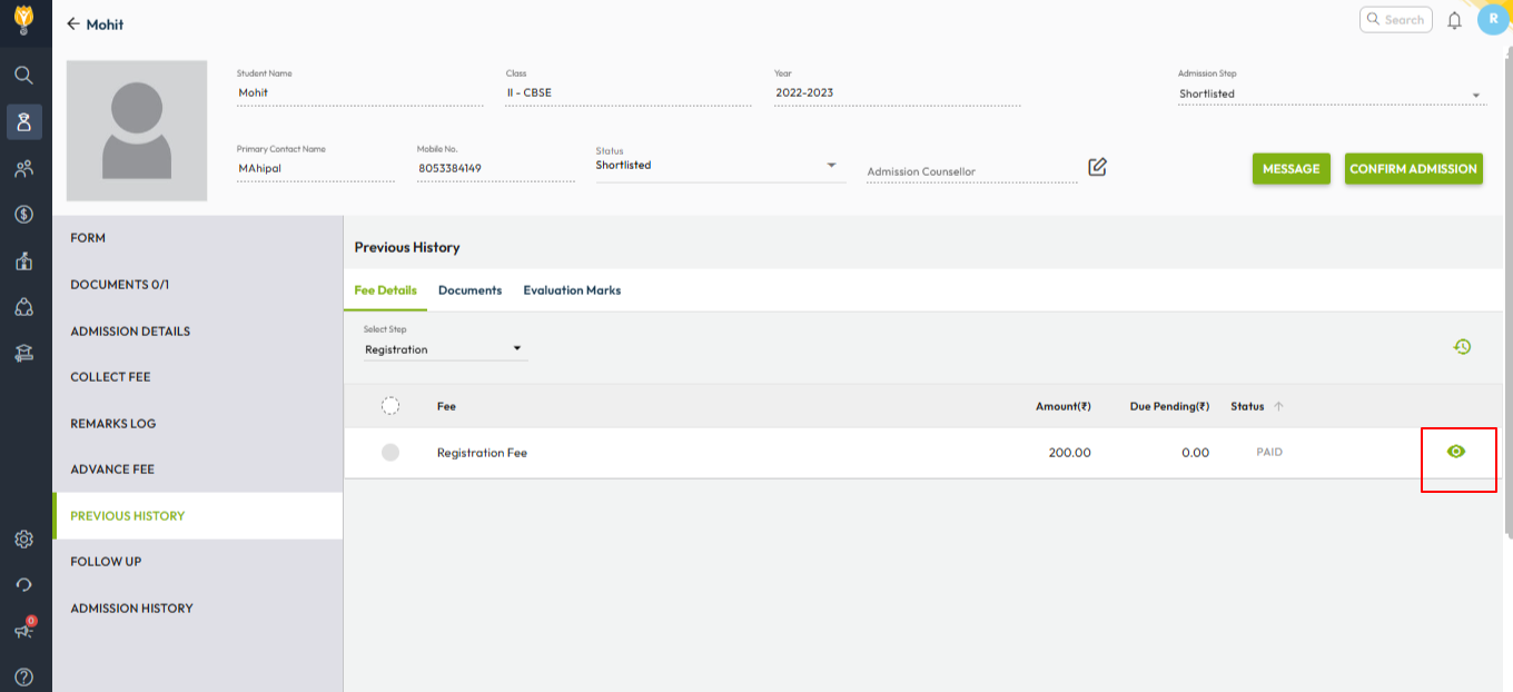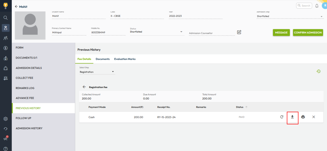 6. After clicking on the Eye icon you are able to see the download option for that receipt. Same way you can download the both Application and Registration fee.