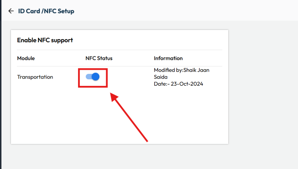 Once enabled, the NFC card must be configured and issued to students, and transport staff should use NFC-enabled mobile devices to scan cards and mark attendance during pickup and drop-off.