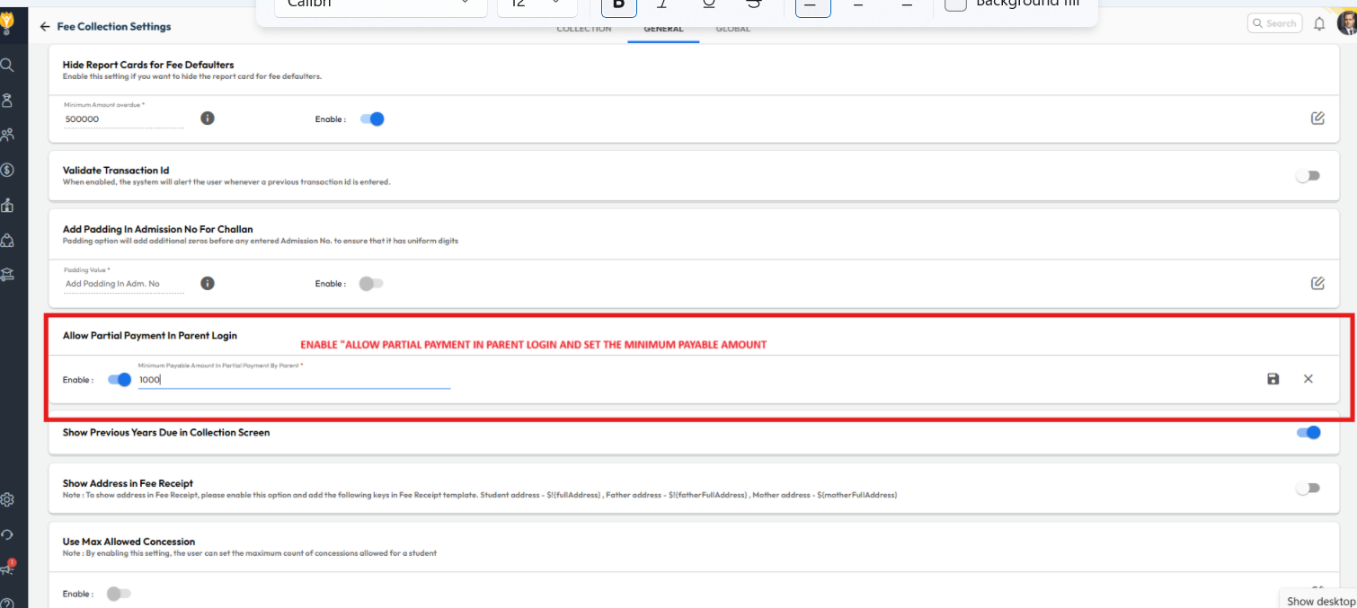 Schools can allow parents to make partial fee payments instead of paying the full amount at once. This setting can be enabled from the Fee Collection configuration.