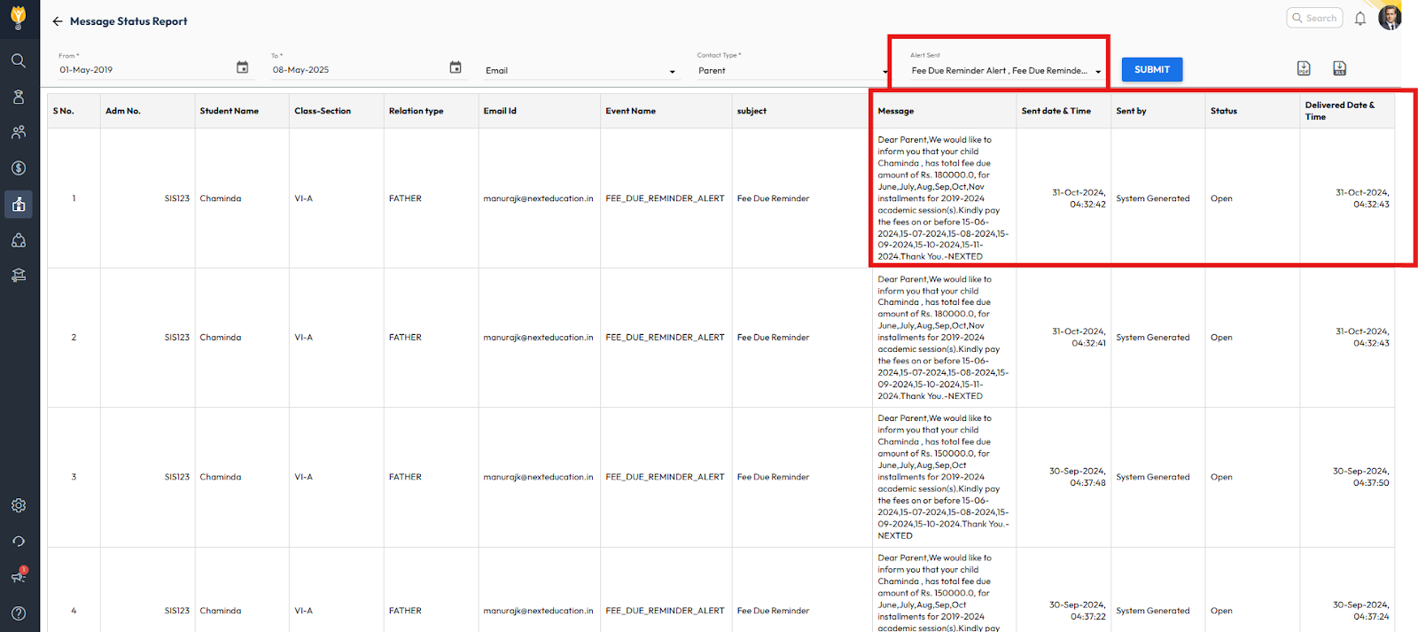 To verify whether fee due alerts are being triggered and delivered successfully, you can check the Message Status Report in the Communication module.