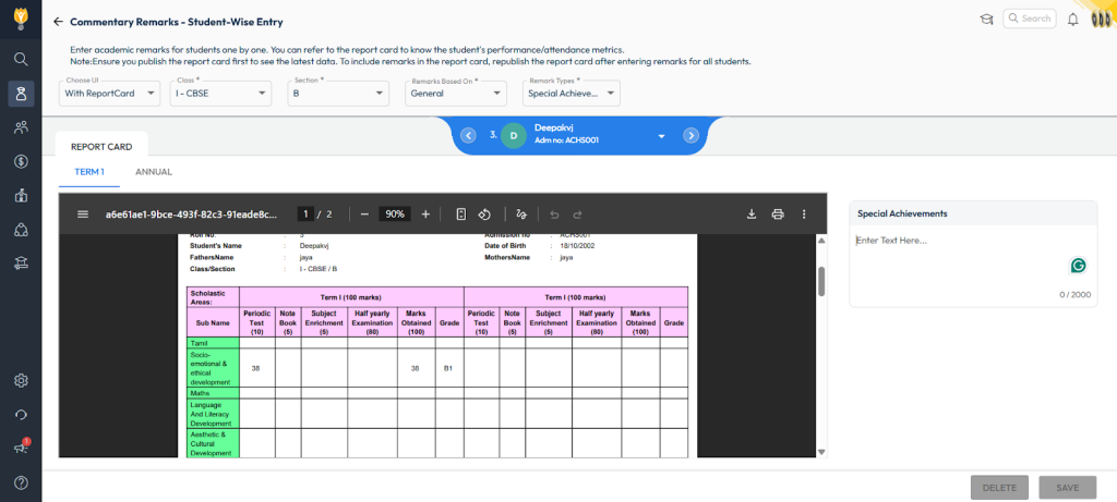 Tip: A report card preview is shown on the left side for reference while entering remarks. - Type your remark in the designated field (e.g., performance feedback, strengths, areas of improvement).