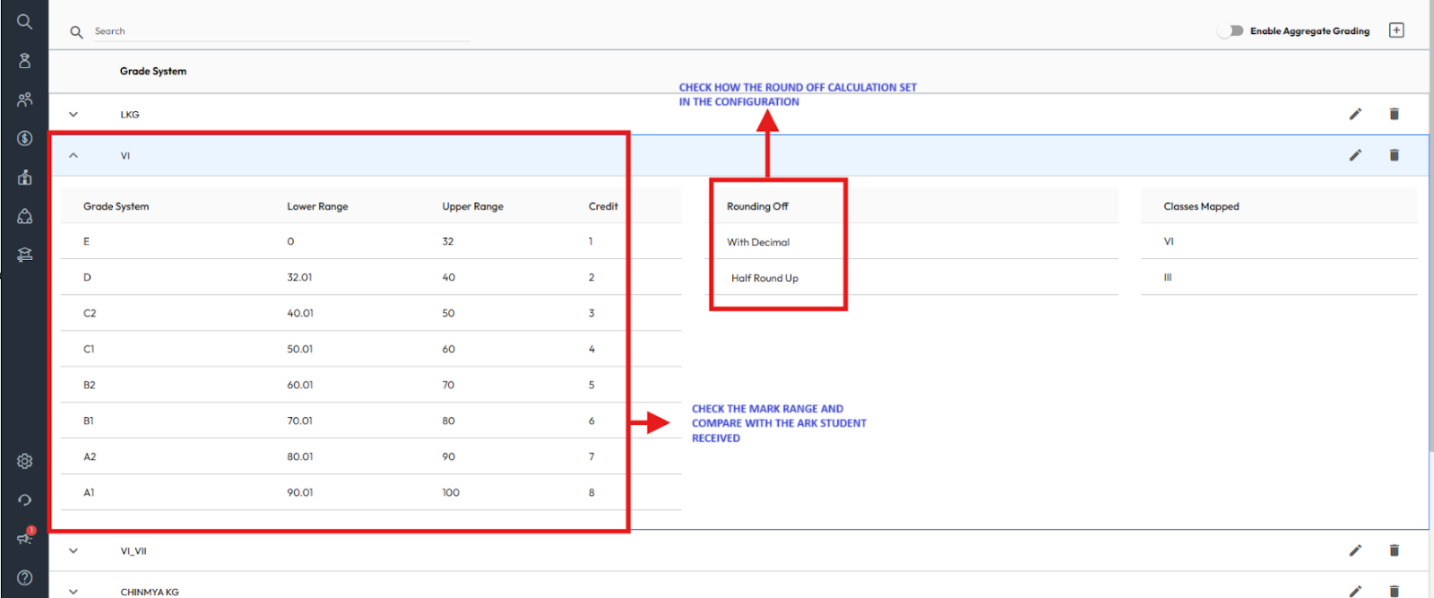 If the grades displayed do not match the marks, you should first verify the Grade System configuration and then check the grade system mapping in the Examination Hierarchy.