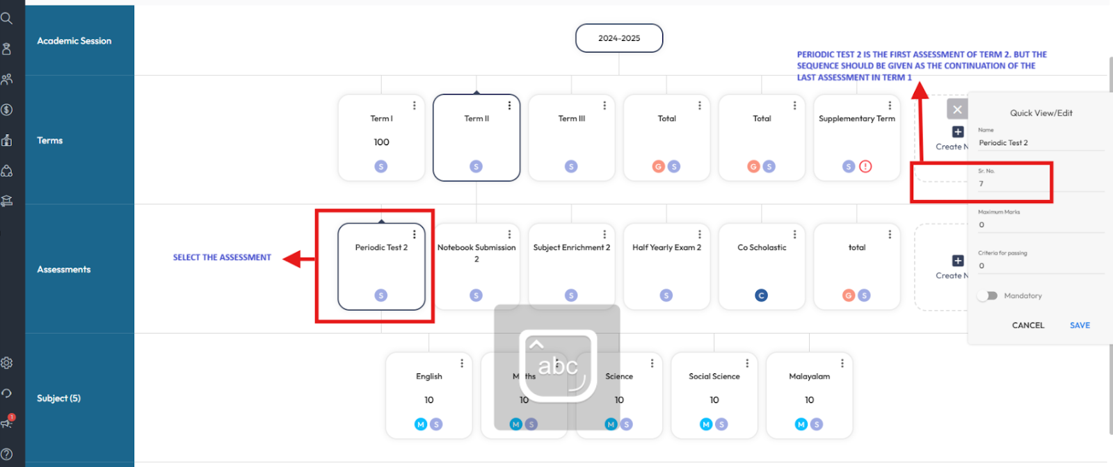 Tip: When assigning sequence numbers for Term 2, continue numbering from the last assessment sequence of Term 1. This ensures the assessments follow a continuous order and appear correctly in the report.