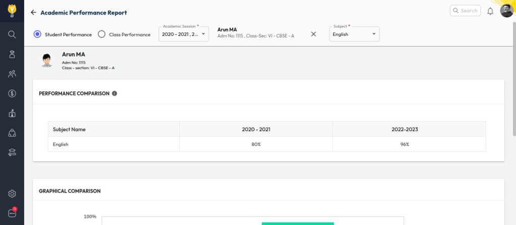 - The student’s performance for the selected subjects & academic session’s will be displayed on the screen.