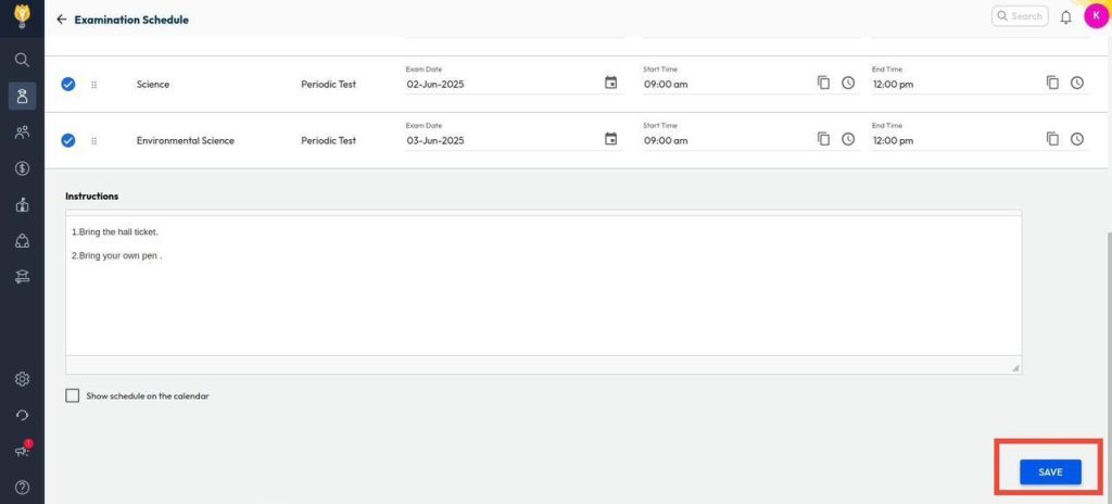 - Choose the subjects to include in the schedule, enter the exam date, start time, and end time, and click Save.