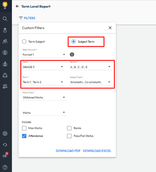 - In the filters, first select the Subject Term, then choose the Class, Section, and Term.