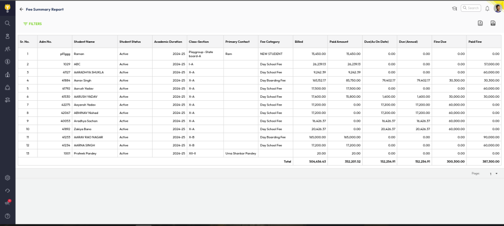 - Pending Dues: Displays the pending amount of fees yet to be paid by the student as of the current date.