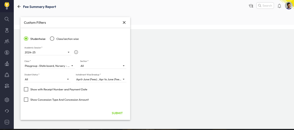 - Apply the required filters in the required fields (such as Academic Session, Class, Section, Date Range, etc.).