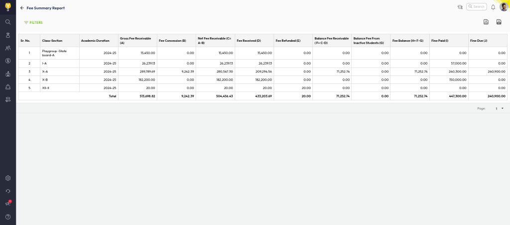 This summary is crucial for schools to effectively monitor fee collections and overall financial status.