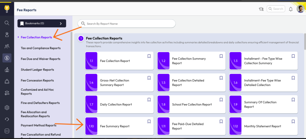 - Click on the Finance > Fees > Fee Reports module (Transactional side).