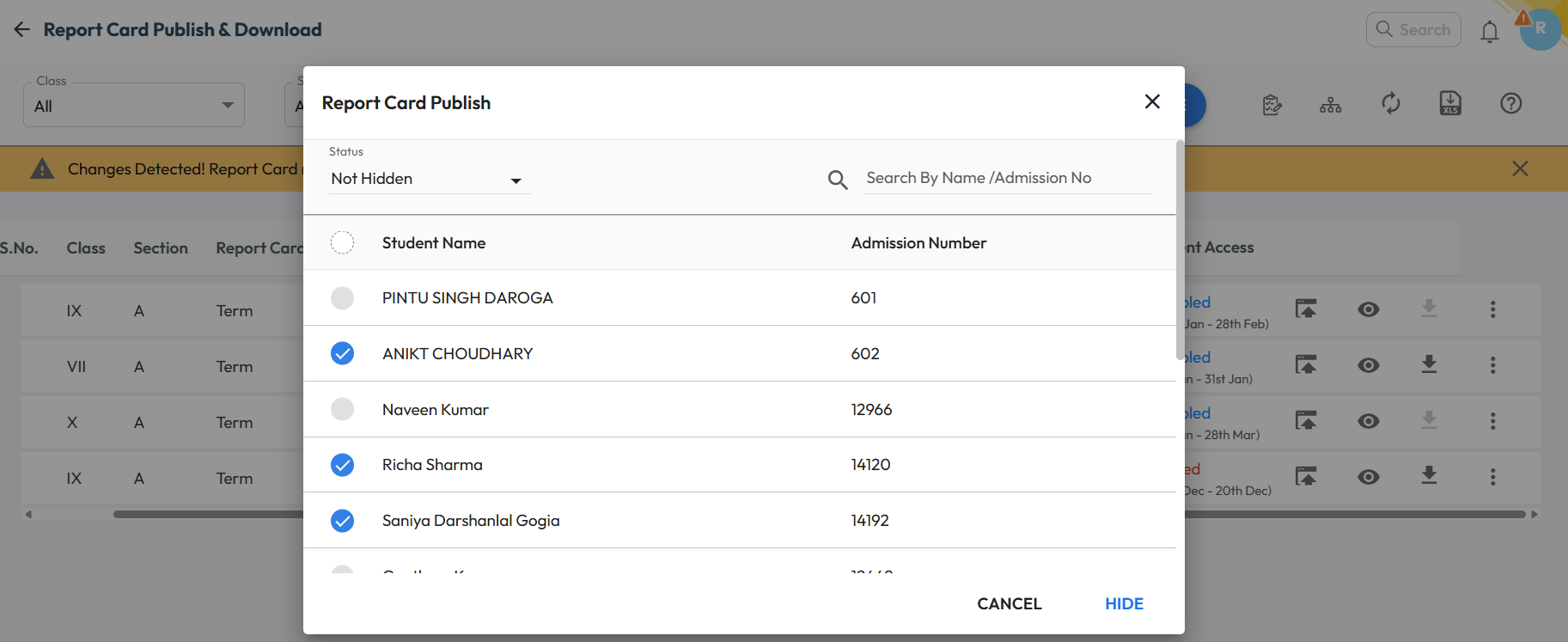 - Choose the students for whom the report card should be hidden