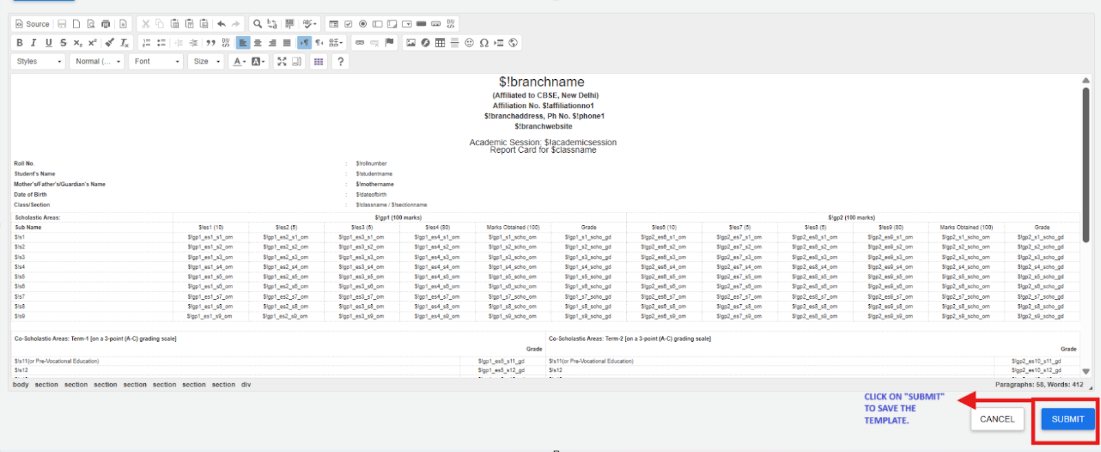 Editing a Report Card Template should only be done if you are familiar with the Visual/HTML Editor. Incorrect modifications may break the layout or disrupt data mapping.