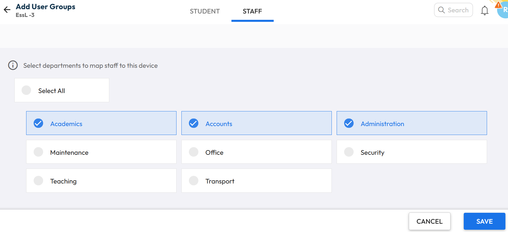 - Switch to the STAFF tab, select the departments to link and click Save.