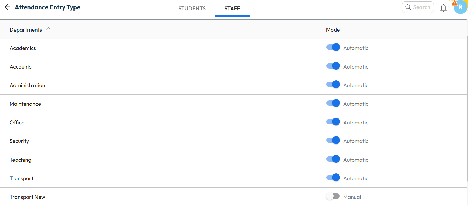 - Set the Mode to Automatic for the required departments (staff) or class sections (students) whose attendance will be marked via biometric devices.