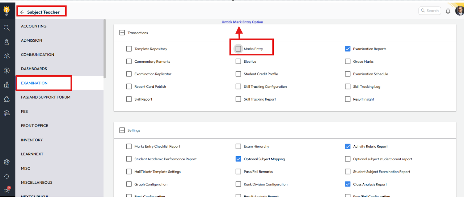 - Uncheck the Mark Entry permission to disable the option of marks entry for subject teachers.