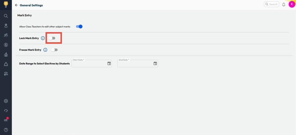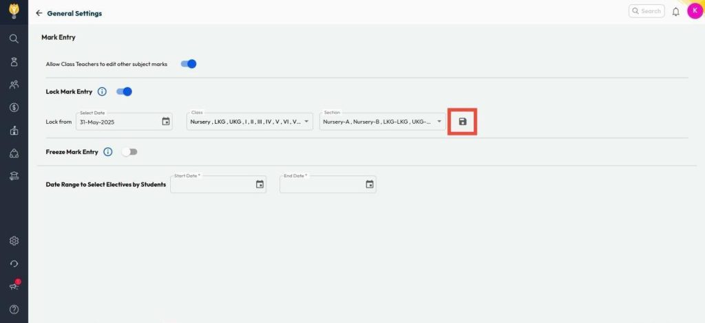 How can I lock marks entry? Navigate to Settings > Student > Examination. Click on General Settings. Turn on the toggle against Lock Mark Entry. Select the Date,Class and Section. Click on Save. Video Tutorial : Was this article helpful to you? Yes0 No0 Related Posts:How can I create an exam structure for Pre-Boards?How can teachers record absent "AB" for students who…How can I enter student-wise commentary remarks?How can I change report card publication dates for…How can I generate report cards for students?How can I view the configured exam structure for the…
