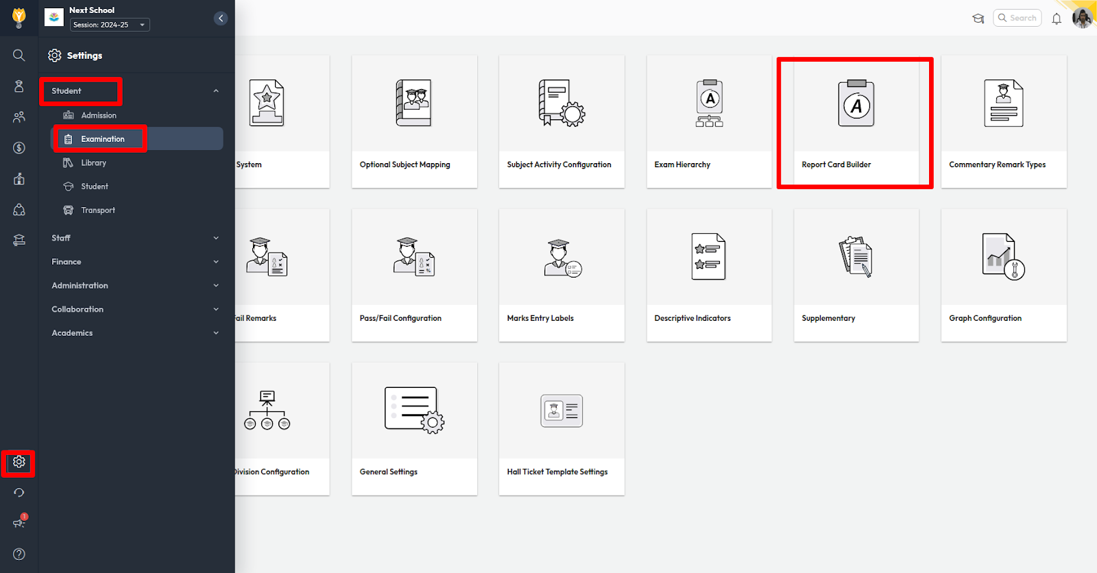 - Navigate to Settings > Student > Examination > Examination Settings > Report Builder.