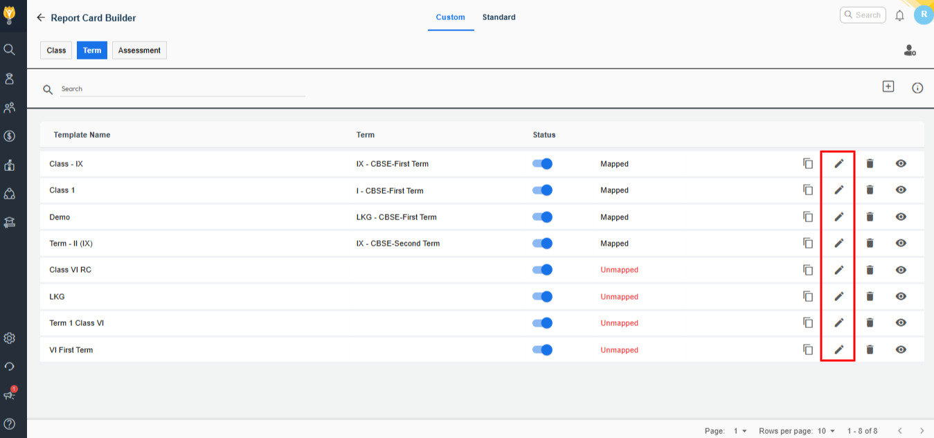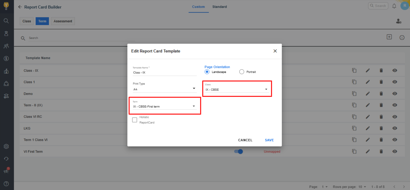 - A list of class groups will appear. Select all the class groups you want to map the template to (you can select multiple using check boxes). Choose the Term as Term 1 from the drop down or filter option.
