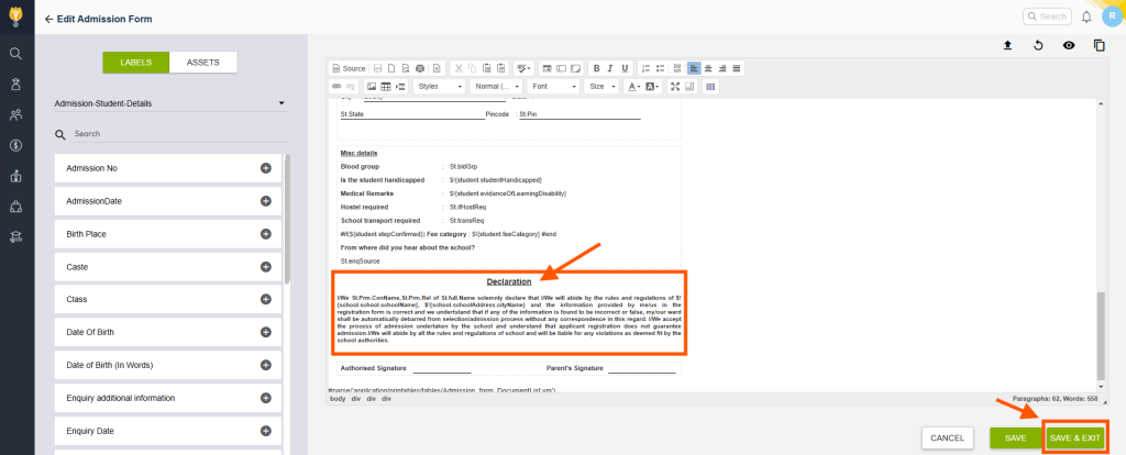 next to the selected template and choose Edit Template. - Make the necessary changes to the Declaration, then click Save and Exit.