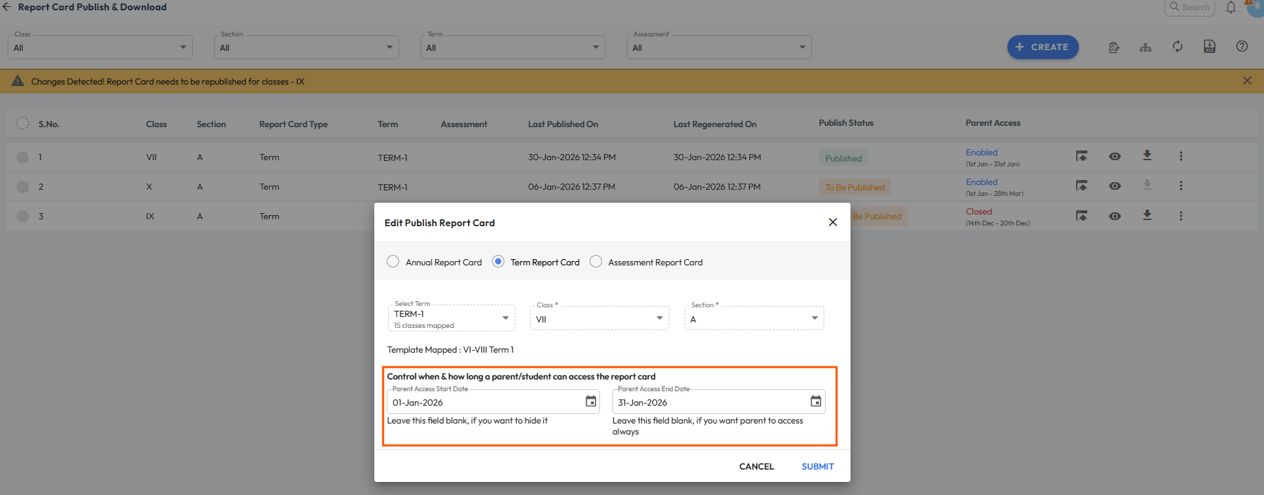 You can do this for an already published report card, or set parent access while adding a new one. - Set the Parent Access Dates :