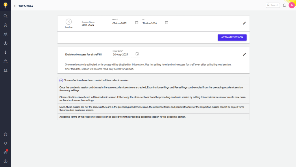 - Navigate to Settings > Administration > School Setup > Academic Session.