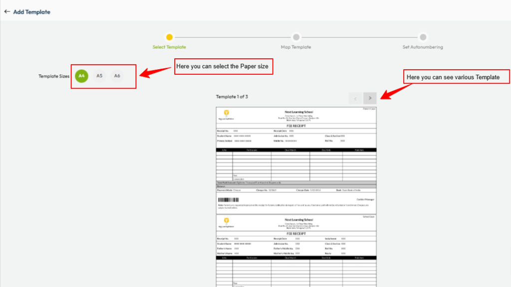 - Navigate to : Settings > Finance > Fee > Fee Receipt Template.
