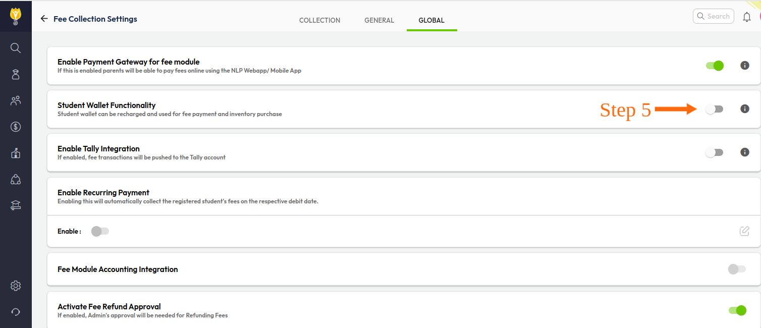Step 5- Enter the Global tab and enable the student wallet functionality.