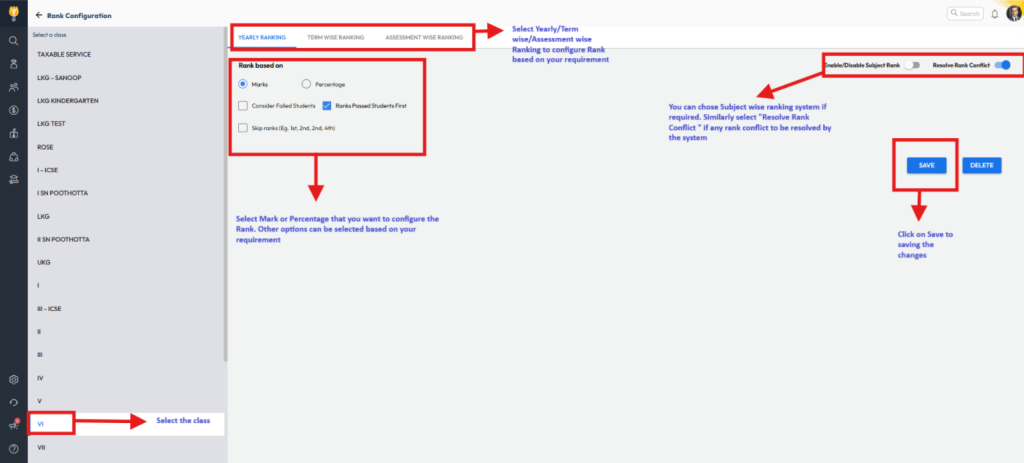 - Configure ranking for Assessment/Term/Yearly Ranking by selecting Rank Based On (marks or percentage).