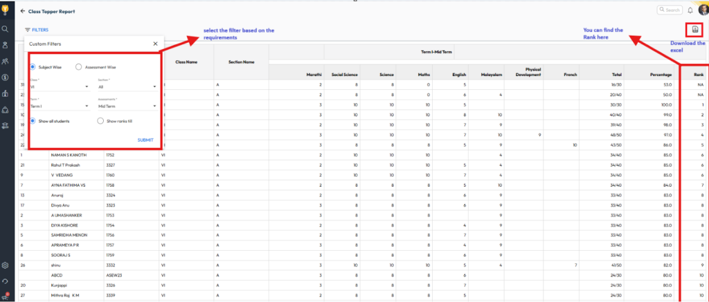 To view the topper students for each class, ensure that rank configuration and report card publishing is completed.