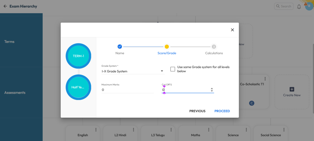 Tip: Maximum marks are also used to define the weightage at that level. Ensure the appropriate keys are configured in the report card template for correct conversion and display of values.