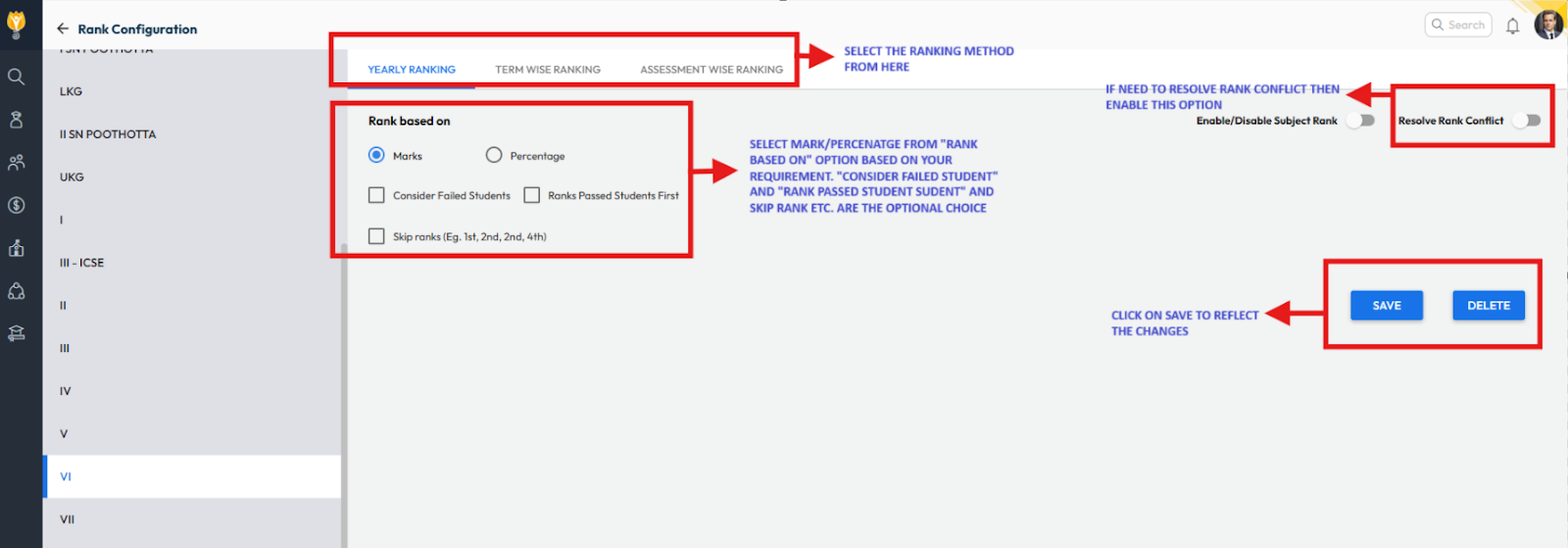 - Set Rank Based On (Marks or Percentage).