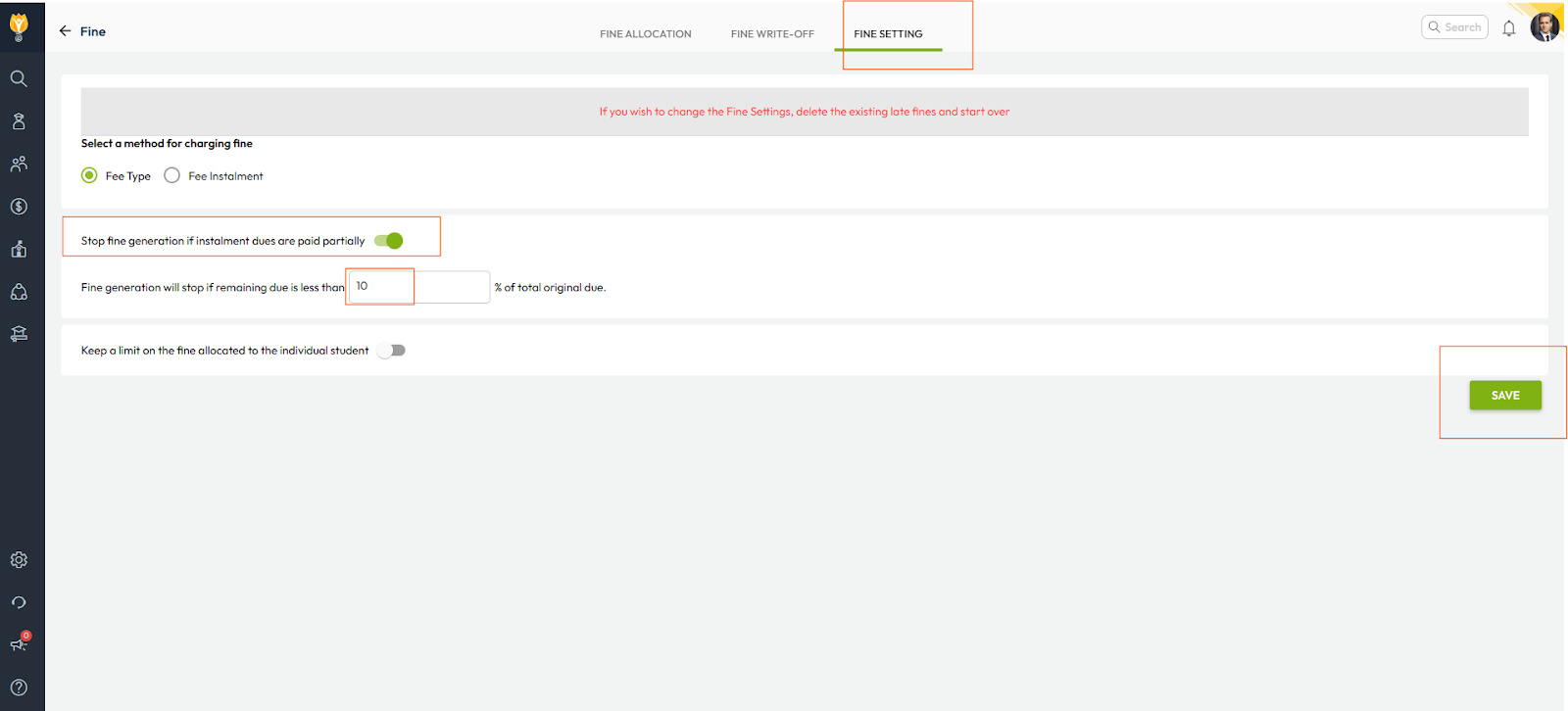 2. Enable the option “Stop fine generation if installment dues are paid partially”